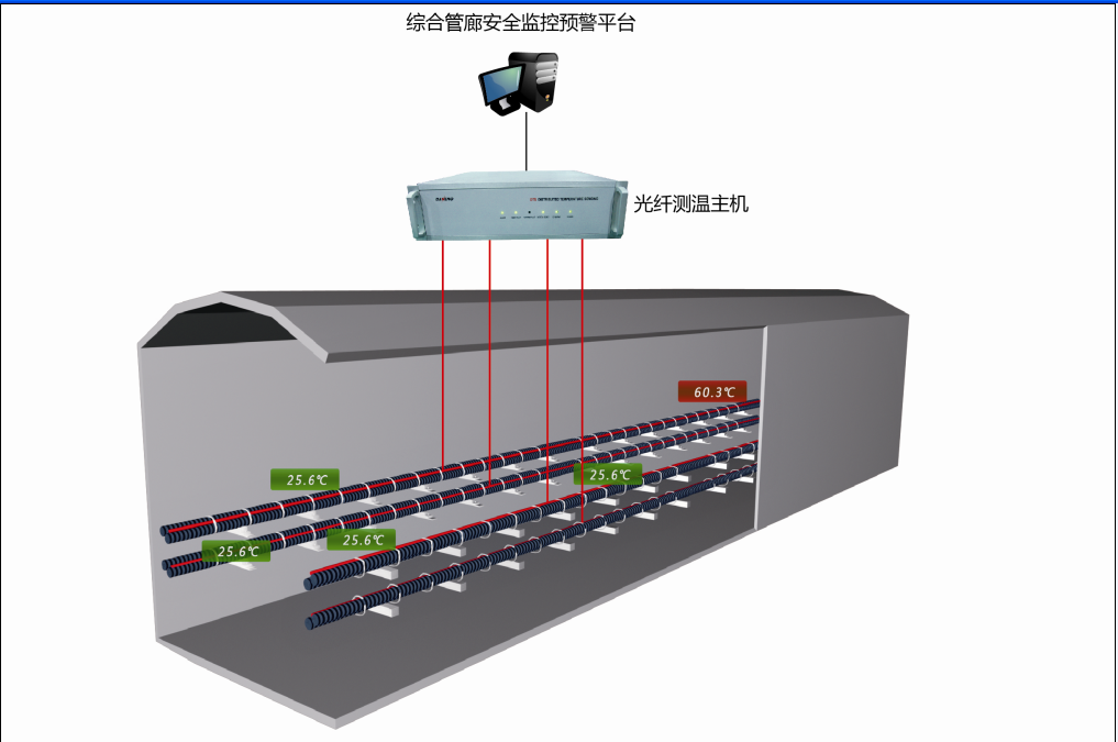 溫度監(jiān)測是目前國內外電纜運行監(jiān)測中被認可的一項重要手段。電纜接頭阻抗增加、電纜負荷過大、絕緣皮老化或者電纜本身局放等原因,致使電纜表面產生溫升,電纜絕緣層和保護層產生陰燃,并伴隨熱量、可燃氣體的產生,隨著溫度進一步上升則產生煙霧,進而發(fā)展為火災。分布式測溫系統(tǒng)通過實時監(jiān)測電纜溫度變化,在事故發(fā)生初期準確判斷異常,提前預警,并精確定位,防患于未然